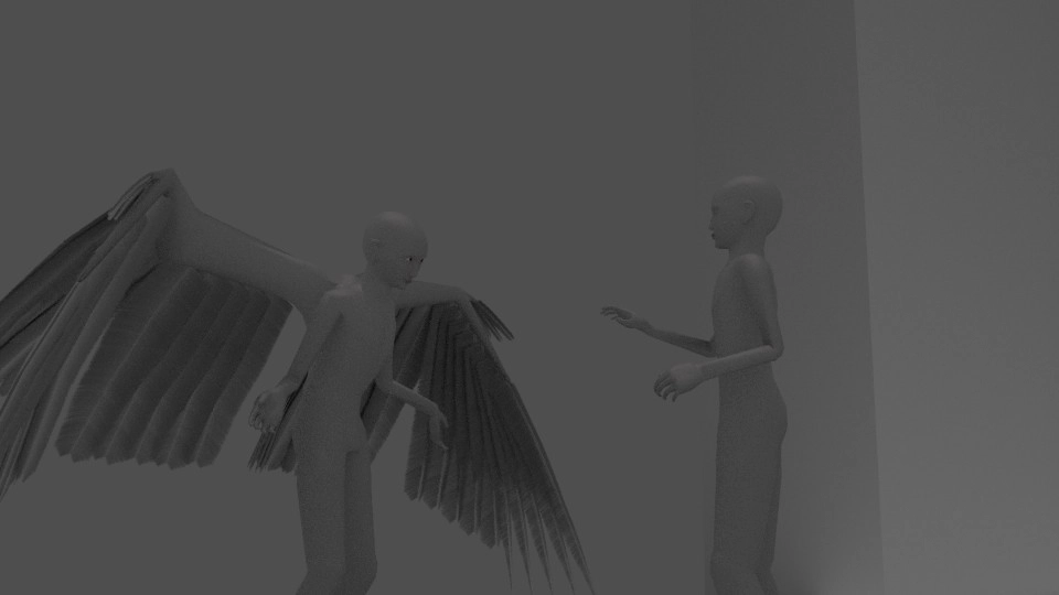 Avi showing off its feathers to an admiring Base. Turned off the covert layers so the viewport animation would play in real time (going to have to just toggle visibility when there’s lots of characters) and left them off so it would render a bit quicker. Going to do a couple of refinement passes and decide whether I’m going to interact with them this time round or just have them fly off.