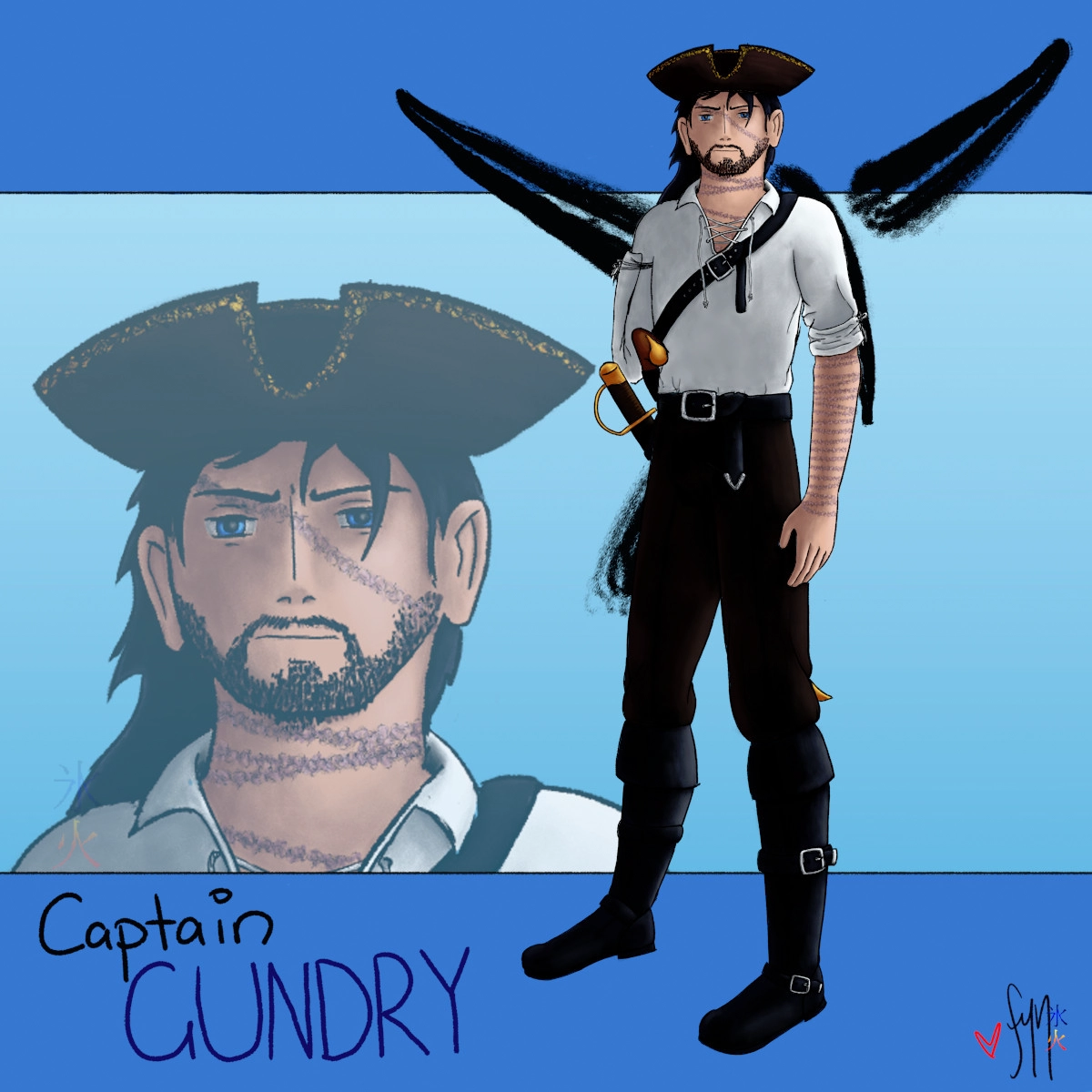 Captain Gundry is the NPC captain of a pirate airship sloop in a World of Darkness game (set in a steampunk AU). The players have all ended up aboard his ship somehow or other (one of the friends seems to have been already on there, eldest’s character was rescued from a slaver ship and then recruited, and mine was supposed to sneak aboard and stow away but as some circumstances changed drastically in the prelude which meant she had lost her reason for stowing away, has ended up just being brought aboard by the “scary crow captain” himself).