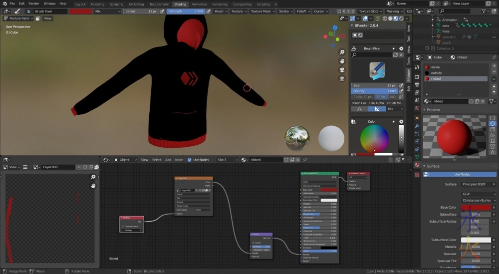 As I said in the last progblog, I had been intending on sketching Zara in a hive hoodie as I’ve drawn her in a steem hoodie previously, and then decided I should use her model instead. Some fixing was required and that had to be done anyway so it got done, and then I made the hoodie together out of a cube.