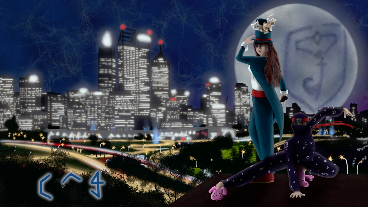 The background is an overpaint of a photo of Perth (Western Australia) from King’s Park and the cats in the hat was a stock photo of some cats in a round cloth container that happened to be roughly the shape of the hat I wanted to make. I found them on Google and have lost the links -_-