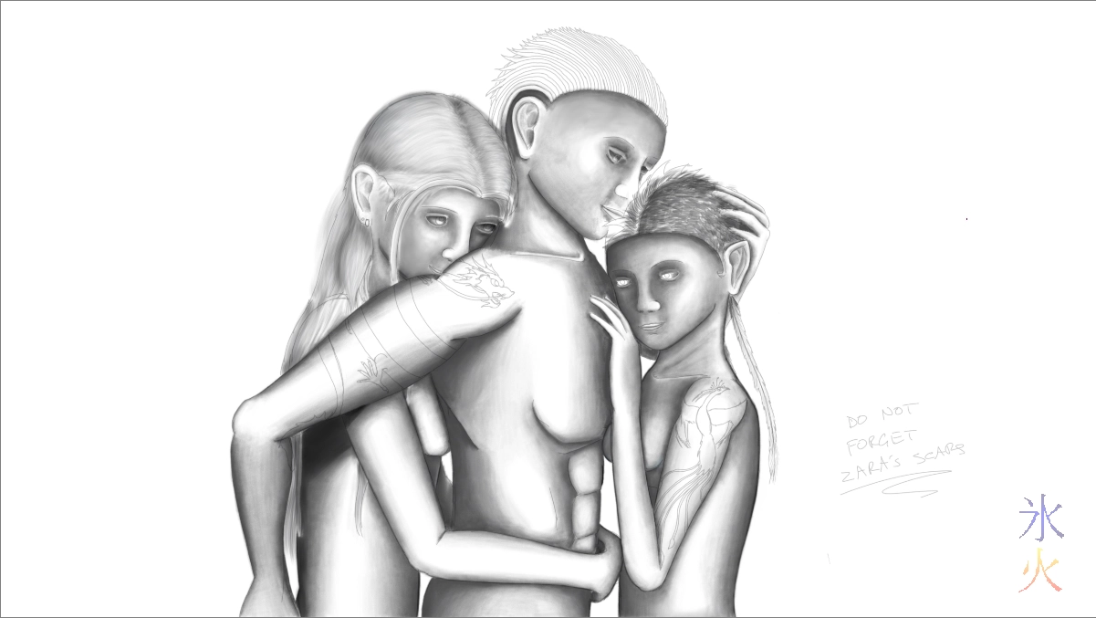 Some time later (ie in very recent history) I decided that I really should do a decent drawing of Juan, Dak and Zara’s tattoos (and possibly a drawing at all of Juan XD). Which somehow in my…er…“brilliant” mind also became the perfect opportunity to both revisit Who Says Three’s a Crowd and show Zara without the ever present goggle sunnies and arm socks.