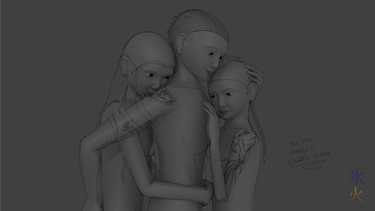 The tattoos took most of a day each and after I was well into the first shadow layer I was wondering what the hell I was doing, especially as I had to turn off the colour layers to see what I was doing on Dak due to the dark skin. Last night my hand was hurting and I decided I’d had enough and was done. Then my sister pointed out some stuff that I’d missed so I attempted to fix it for another half hour before deciding I was definitely done and everything else was going to be “stuff to remember for future anything if I ever draw again”.
