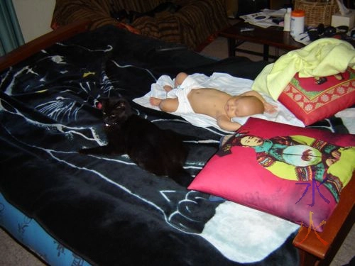 And finally…a question that has been plagueing humans for centuries, how the hell is it possible for a small baby (~60cm/5.5kg +/-) and a smallish cat (4kg +/-) to take up an entire futon? :)