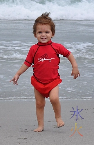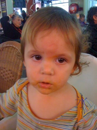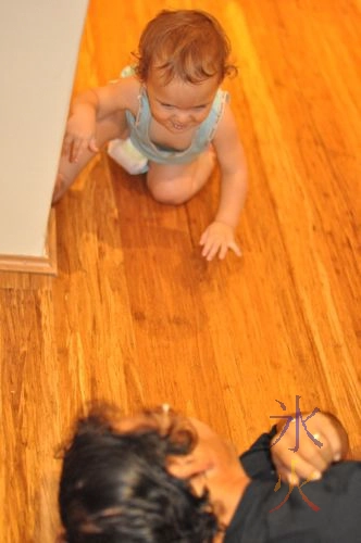 The sixth month of Cub saw an increased interest in solids. One of his first foods was strawberry (or ’tawbee’ as he would have it these days). That’s him there twisting around to get his gums about the berry in question, and that’s his arm, hand hidden inside a then-too-long one piece suit with a death grip on JJ’s arm so JJ couldn’t take the tasty treat away.