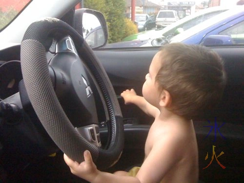 This would have been part of a triptych if I was less lazy. In the twenty first month of Cub, the toddler was quite certain he could drive. Here he is checking his mirrors. In a photo before it, he was starting the engine (playing with the keys, he didn’t actually start the car), and in the next photo he is looking over his shoulder and making like he’s turning the wheel while reversing.