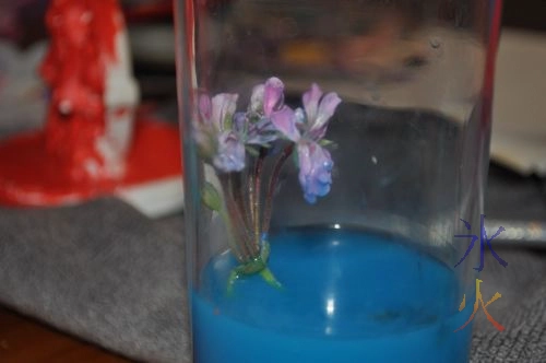 6yo and 4yo set up an experiment to turn a flower blue, directed by 6yo, who had seen a demonstration on some science show on ABC. They made the blue water with paint and water (as we don’t have food colouring). They then went on to do some other arty crafty thingies while they waited for the colour to be drawn up to the flower.