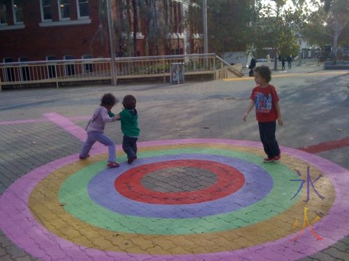 Outside roughly in the middle of the “Cultural Centre” there is this concentric circles thing painted on the path. There are different coloured lines that extend outward from it. I don’t know what they’re for but the kids had fun following the lines. The pink one leads to the train station and the green one goes to the museum.