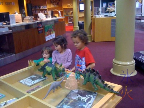 There had been a school group or two in the Discovery Centre when we first trekked in there. They were gone after we’d poked around for a little while so we headed over to the tables where they had been as 6yo had seen some puzzles that he wanted to try out. On the way we distracted by a pink-haired girl carting around a snake named Wilma. Then the kids got distracted by the dinosaurs.