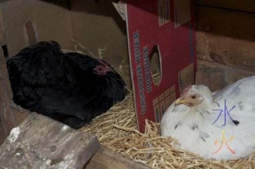 Well Powderpuff, the white one, definitely is. Her eggs should hatch on Monday or a few days later. I’m not sure if Tempest is brooding or whether she just happened to be sitting there laying an egg, and whether she stole Billie’s nest. All I know is, Billie is off the eggs she was brooding and Tempest is sitting on her nest.