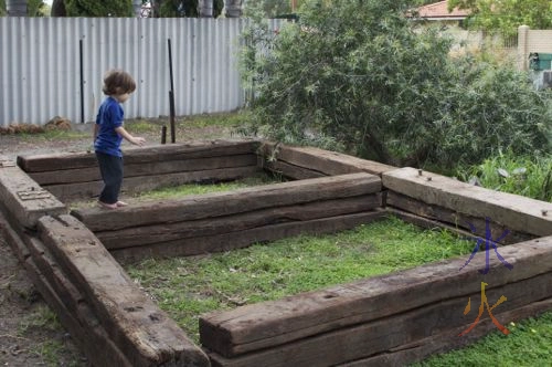 We have fruit trees sprinkled around the front yard mostly up near the fence as the two huge trees keep most of the front yard in perpetual shade. There’s light enough for vegetables though, so we’ve been planning for a while to have a raised bed or three out there once we had the money. Now that I’m working part time, saving is faster. We grabbed a tonne (okay…21…but together they probably did weigh a tonne) of railway sleepers from Mountain Movers and made one with two compartments.