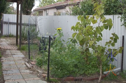 Mulberry tree, side vege patch, apple tree, compost bin, nectarine tree, rosemary