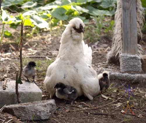 Ella (Aracauna) with 4 of her 5 chicks (out of a clutch of 6)