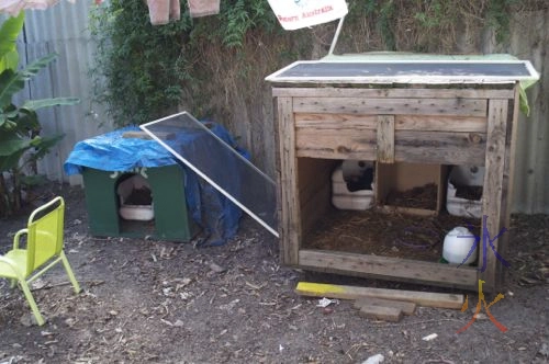 Coop was getting overcrowded with broody hens, so we got a packing crate and a dog kennel for brooding and chick raising