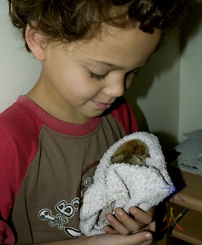 6yo and ‘Stumpy’, a short-legged Japanese bantam cross chicklet who is no longer with us