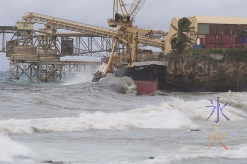 Update2: Went past the Cove with Sprat to stickybeak. The stench of diesel fumes was making my face hurt from the Roundabout. It stank to high heavens when we got down to the actual beach, and instant headache getting out of the car. We still managed to stand there and discuss it and get covered with a thin film of oil as the waves crashed in and scattered oily salt spray everywhere (Sprat had to clean her glasses when we got back into the car, and later on when JJ went down with the camera he had to clean his lens when they got back). There were a few people down there taking photos. The ship had split completely in two; the front half is stationary resting on the reef and the back half is still pounding against the cliff. What had happened with the Port crane was that the crane from the back half of the ship had collided with the bottom of the crane on the Port so the foundations of that need to be checked now. I felt really sorry for the people living in Kampong that have to put up with it all the time. Can’t be good for them.