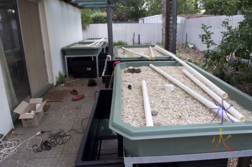 JJ spent the last couple of weeks flat out getting an aquaponics system up. We got the siphons between each set of tanks going but the overflow leaked, so he had to go and get something else from some aquarium shop to seal it with. It has to cure for the next 4-7 days, which means we’ll be trying the overflow again on Monday.