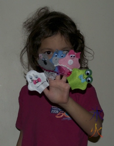 On our last trip to Riot to get her another canvas, she decided to try something new while we were floating around in the craft section looking for something for her brothers to do while she was painting. She decided to try something different and grabbed a no-sew finger puppet kit. “No-sew” meant the finger puppet shapes were already sewn, and they came with a bunch of accessories that could be glued on.