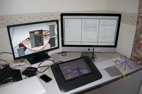 That’s a Mai Hime (article contains spoilers) wallpaper visible in the background on the 21" monitor behind my Lightwave panels. An AR script is on the 27" and my comparatively tiny little 12" Cintiq has Lightwave on it. I wasn’t quite reading and modelling simultaenously, the reading happened when the modelling was giving me a headache. Lightwave gets swapped between the big screen and the small screen semi-regularly depending on what I need to do with it; it goes to the big screen when I need to do fine detail work while being aware of the surrounding area, otherwise the model is being worked on directly on the Cintiq. I did attempt to stretch it over both screens but the vast difference in resolution (big screen is 2560x1440, small screen is 1280x800) made it laggy and somewhat uncomfortable.