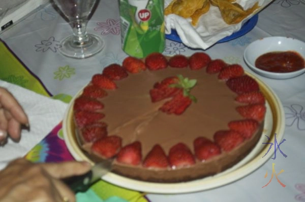 Mum makes awesome desserts. Here we have chocolate cheesecake with strawberries. Think it was the 3rd round of dessert for the 60th birthday.