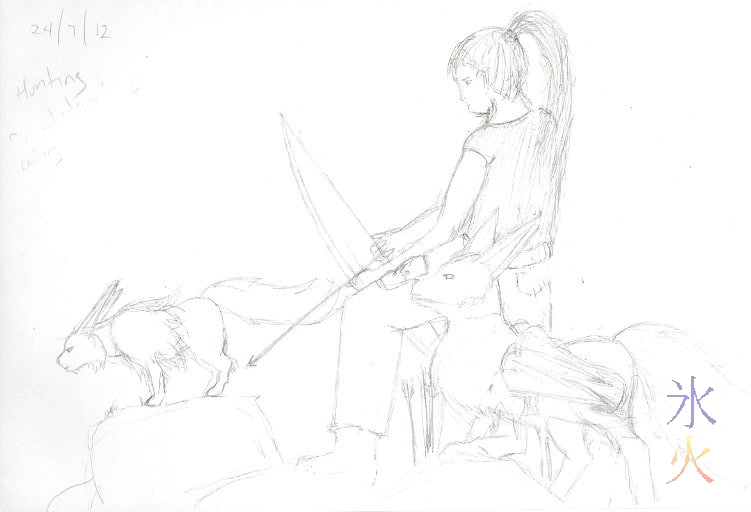 posted on: Sunday, 5 August 2012 @ 12:15pm inThe kids watched many Pokemon dvds while we were on Christmas Island. I have a Pokemon fanfic sketched out in my head which I don’t give a lot of time to as it’s a very occasional diversion from working on AR. This is sketch of my OT (that’s “Original Trainer” for those that aren’t versed in Pokemon fanfics) and two of her Eevees; Amber (combining cliches, she is an abnormally large shiny mutant, and female!), and Lightfoot (perfectly normal male). They’re hunting whatever might be good eating probably somewhere in the Kanto region.