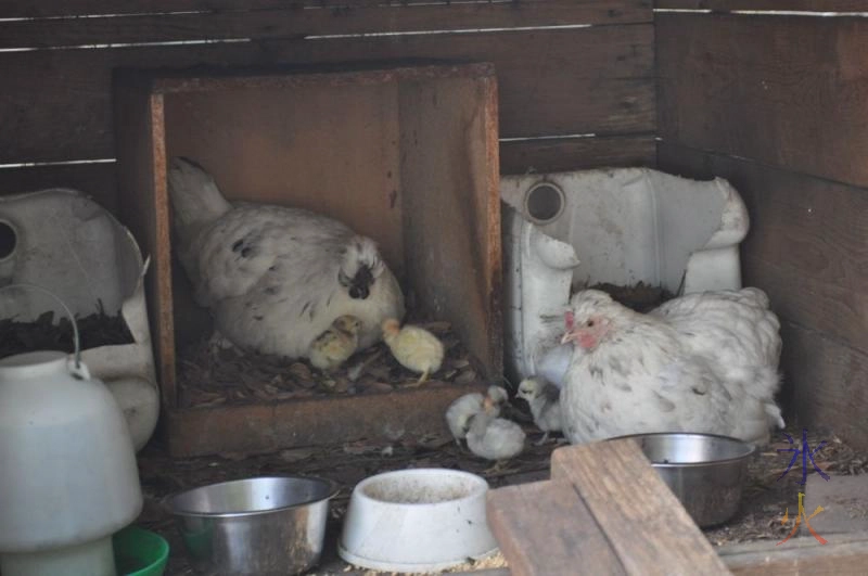 Two mums and their babies (yes they are co-parenting). There’s also a black naked neck chicklet under the foreground hen.