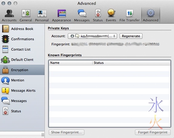 back in the main preferences panel, click on “Advanced”, select “Encryption”, select the account you want to encrypt and press the “Generate” button. A rather long alphanumeric fingerprint will be generated for you and the button will then change to “Regenerate”.