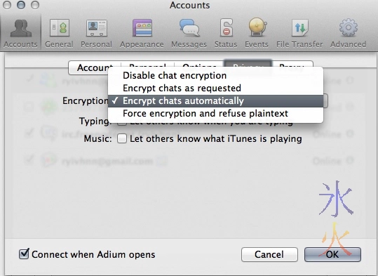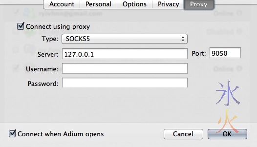 You may have trouble with irc if your exit node is banned by the server you’re trying to connect to or the server disallows connections from proxies. Google tracks where you log in from and panics if you suddenly log in from somewhere different. If you log in to G+ and GTalk on Adium through Tor, it will probably just send you a notification letting you know you’ve logged in from a different ip and was it actually you and would you like to give them your mobile number for the much more secure two-factor authentication? While I was testing I managed to forget I was logged in to G+ on my unTorified browser and tested logging in to GTalk on Adium through Tor (which came through on a completely different ip). Google blocked my attempt to connect over Tor and sent me urgent “account possibly compromised” messages and asked if I recognised the activity. Imagine similar may happen with Facebook and other social networks that provide chat but don’t have accounts to test.