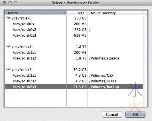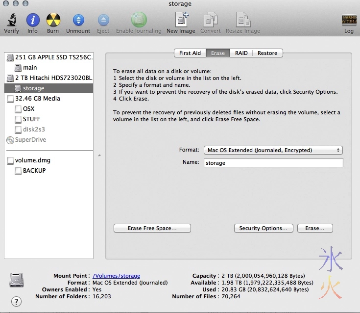 Two partitions you can’t see in this utility but which showed up in TrueCrypt’s browser and on command line tools are the Lion boot partition (650ish Mb) and some swap space (about 200Mb). My secondary drive also appears to have a 200Mb swap partition. If you want this space back or you’re worried about the swap space not being encrypted (I think you specifically need to encrypt it in Ubuntu and Win7, OSX Lion+ FileVault theoretically also encrypts the swap), you can format the top level drive. I conceivably could as I have 16Gb of ram so probably don’t need the swap that much, but I also have a 2Tb hdd so don’t really care. If you’re already feeling nervous, just select the partition (if there are no other partitions that one partition will be occupying the rest of the available space).