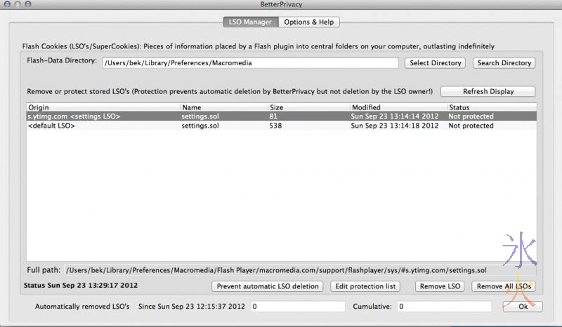 You want to keep <default LSO> which is your Flash player settings. This one will not be deleted unless you manually delete it or explicitly tell BetterPrivacy to delete it. If you recognise any urls as games etc that you play or sites that you trust, you can double click the “Status” of that cookie to change it from “Not protected” to “Protected”. This will prevent those particular cookies from automatically being deleted when Firefox quits (the default behaviour) or when you press the “Remove All LSOs” button (which you may want to do if you happen to have a lot of them that you don’t recognise/trust). It’s also a good option if you don’t want Firefox to always ask if you want to delete the cookies whenever you quit and untick the “Always ask” in the “Options & Help” tab. If you’re feeling particularly paranoid you can tell Firefox to delete cookies at application startup as well as on quit, also in “Options & Help”.