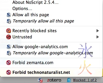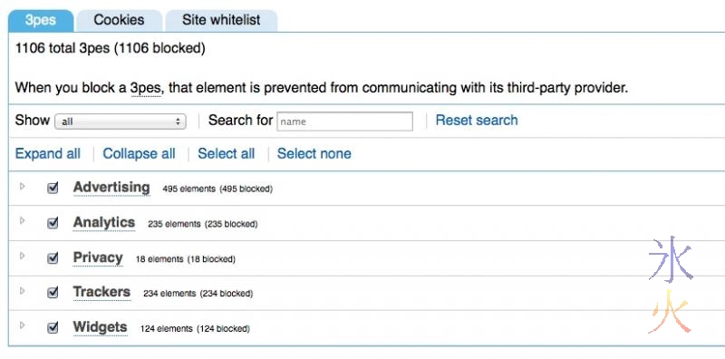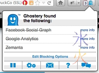 Ghostery: fairly non-invasive. Has a cute little Pacman ghost-style icon (you can see it in the above image next to the NoScript icon). It wants initial configuration which is fairly easy, just click “Select all” in both the “3pes” and “Cookies” tabs, then press the giant right arrow to finish up.