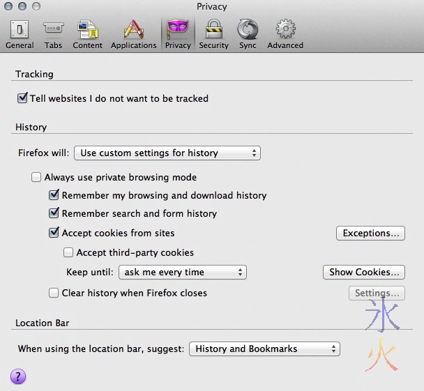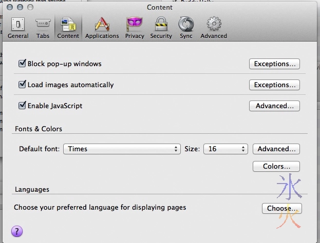 Note: most of the instructions are MacOSX Lion and Firefox-centric as that’s what I use. Firefox is the same across all operating systems. The only difference is the location of their preferences panel; in OSX it’s in the Application menu (it’s right next to the Apple menu in the top left hand corner and will say “Firefox” when Firefox is in focus) and in Win7 and Ubuntu it’s in Edit -> Preferences. Other browsers should have similar settings about the place but you’re on your own there :)