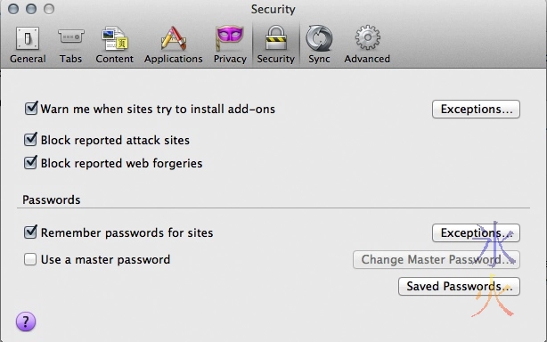 in the “Security” pane, make sure “Warn me when sites try to install add-ons”, “Block reported attack sites” and “Block reported web forgeries” are enabled. Decide whether you want to remember passwords for sites and use a master password, again this is a decision between convenience and paranoia.