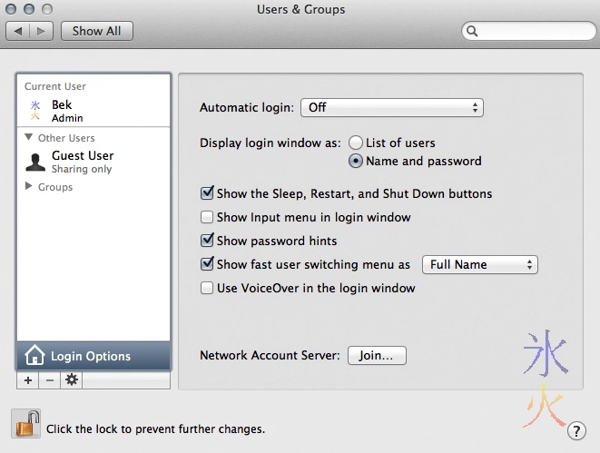Set “Automatic login” to “Off”, set “Display login window as:” to “name and password”, do whatever you like with the checkboxes. If you don’t have a password on your account, click on your account, select the “Password” tab if it’s not already selected, and press the “Change password…” button (it may or may not say “Set password” if you don’t have a password, I’ve always had passwords so don’t know). Set/change your password. Don’t make it too easy.