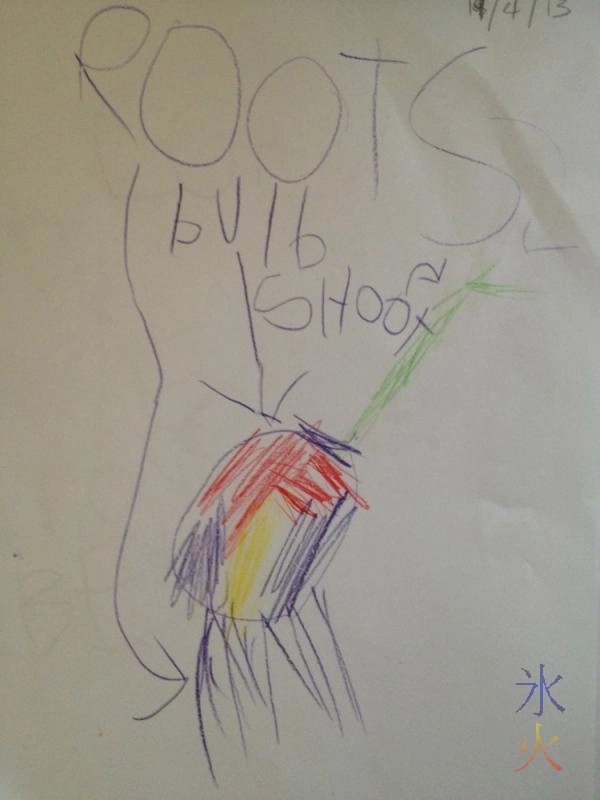 I made some chicken stock and found that one of the cloves of garlic had shot, so showed it to the kids and threw it into a plastic container of water so we could watch the shoot grow and roots form before moving it to the aquaponics to (hopefully) complete growing. Because we had a few things going on at once I forgot to get them to sketch it out on Day 0.