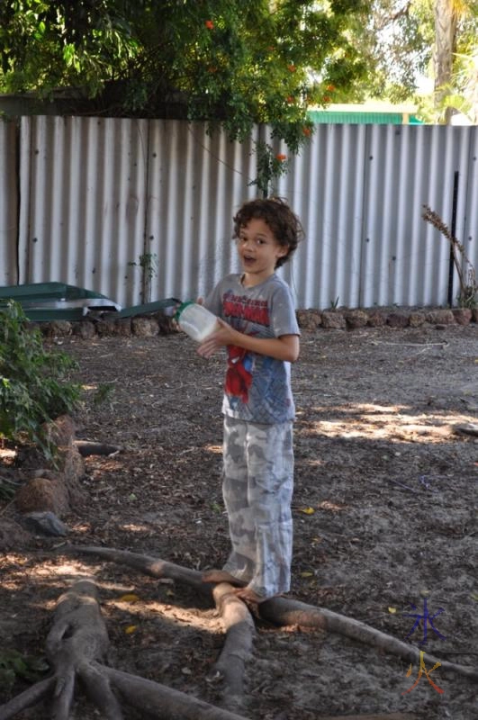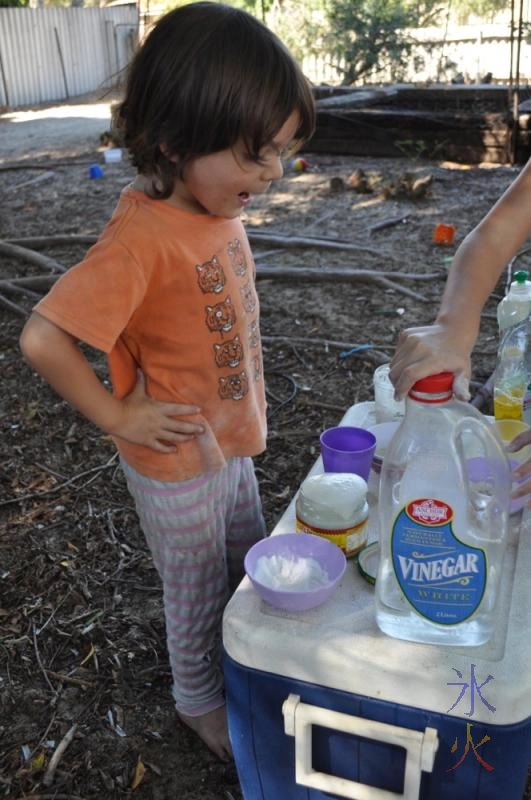 A little bowl of flour. A little bowl of bicarb. The almost empty bottle of vinegar (topped up a touch from the new bottle). A little bowl of rice. A little bowl of sugar. A plastic cup of pomace oil. Three jars with lids for them to mix and shake in. Three measuring cups. All the stuff went on an esky (we don’t have an outdoor setting). After a minor flour spill, the esky got moved to the middle of the garden.