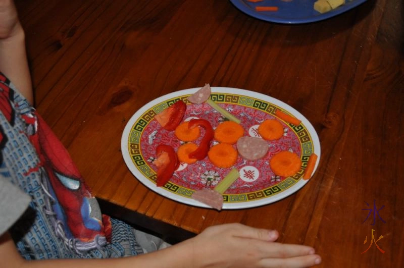 They didn’t really want to stop making potions but I put an end to it by not refilling the ingredients for the third time, telling them I would try to stock up on some things so they would have stuff to mix and experiment with next time. They were ready for a snack anyway and 6yo wanted to make vege faces. I just cut them a platter (which involved some meat and cheese because our platters almost always do) and let them go nuts.
