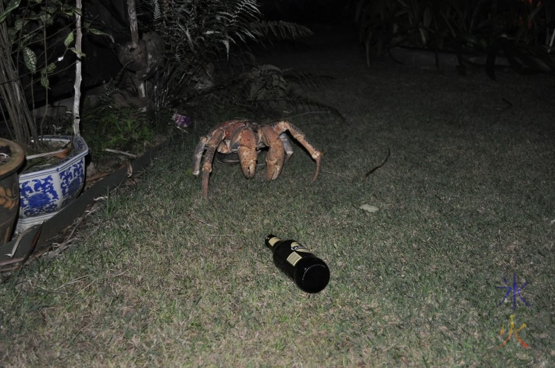 Albert the robber crab that lives under the house, with a beer bottle for size comparison
