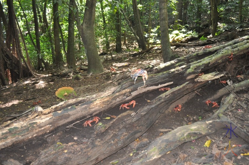 Red crabs eat mostly leave that have fallen from trees (which is why there’s not a lot of leaves on the ground where they live). This one was carrying two back to its burrow, prompting the kids to call it ‘greedy crab’ as the others they’d seen were only carrying or eating one at a time