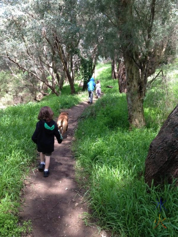 In Open Area #2 (just through the trees from the photo of Open Area #1) 6yo was quite excited to find some pink versions of the yellow flowers that were everywhere. I went to take a photo and caught a photobombing dog that of course had to go and investigate what 6yo was excitedly pointing at.