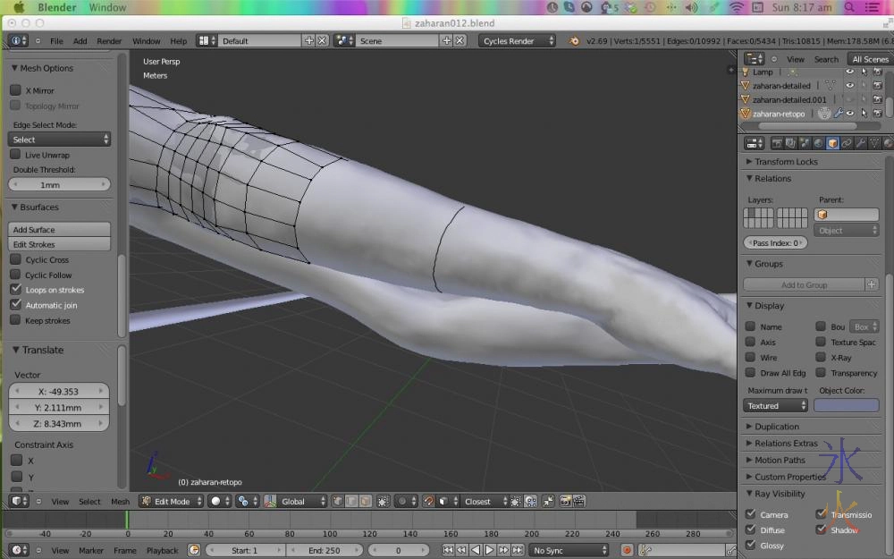 Cross-hatching mesh onto the face which I don’t do anymore as I eventually found it quicker to just highlight edges and keep extending it rather than constantly merging points (mainly as I don’t know how to merge a strip of points)