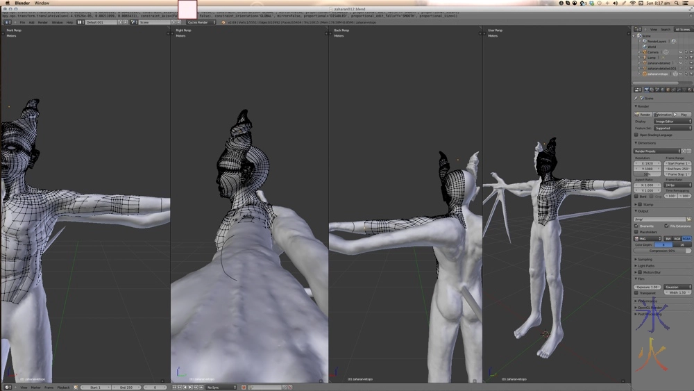 There was a stall when I had some confusion about how I was going to do the wing membranes and the tail paddle, as there were messy sticking out bits between the wing spines in the model. The options I came up with were cleaning up the wing spines and putting the membranes in during retopo, or doing the membranes in either Blender or Sculptris. The first option leaves me with ridiculous paper thin membranes which I would then either need to thicken somehow or normal map. I went back to Sculptris to add in the wing membranes.