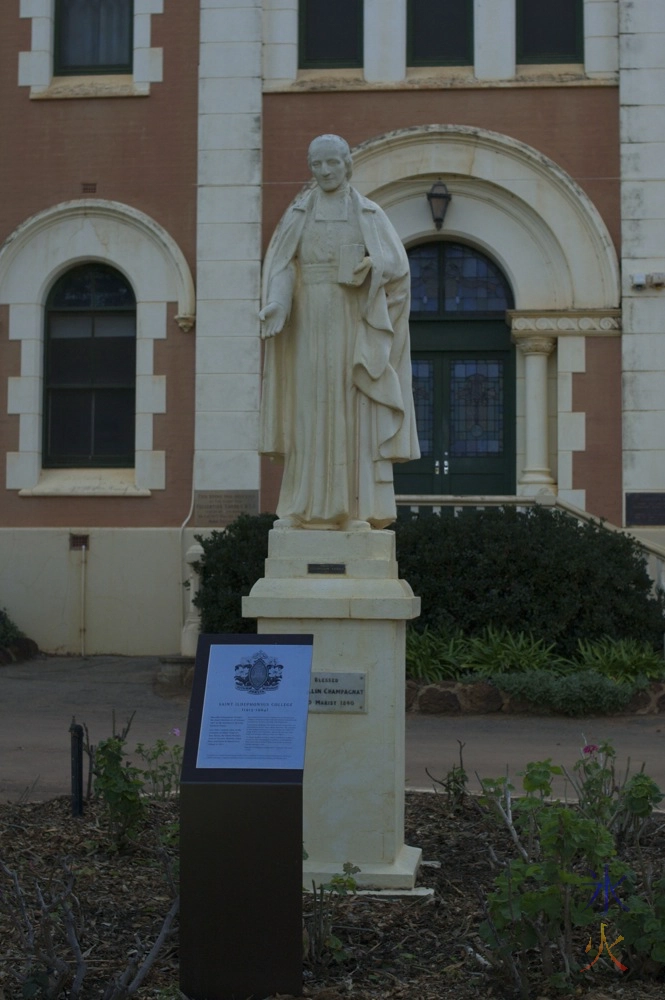 Statue out the front of St Ildephonsus College with helpful information sign