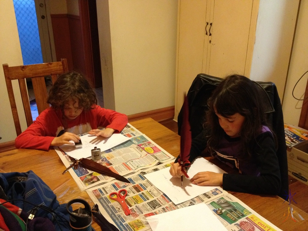 We investigated some cottage sites as we headed back towards the car, and 9yo started on his usual sad about how it wasn’t fair that some people got better things than other people just because they were full of poorly justified self-importance. The kids played with their tablets for a little while before falling asleep on the way home. When we got home they wanted to use their quills. I told them the quills were a top shelf item (meaning they went on the top shelf in the art cupboard where the things can’t be used without adult supervision), and showed them how to use the quill, ink and blotters.