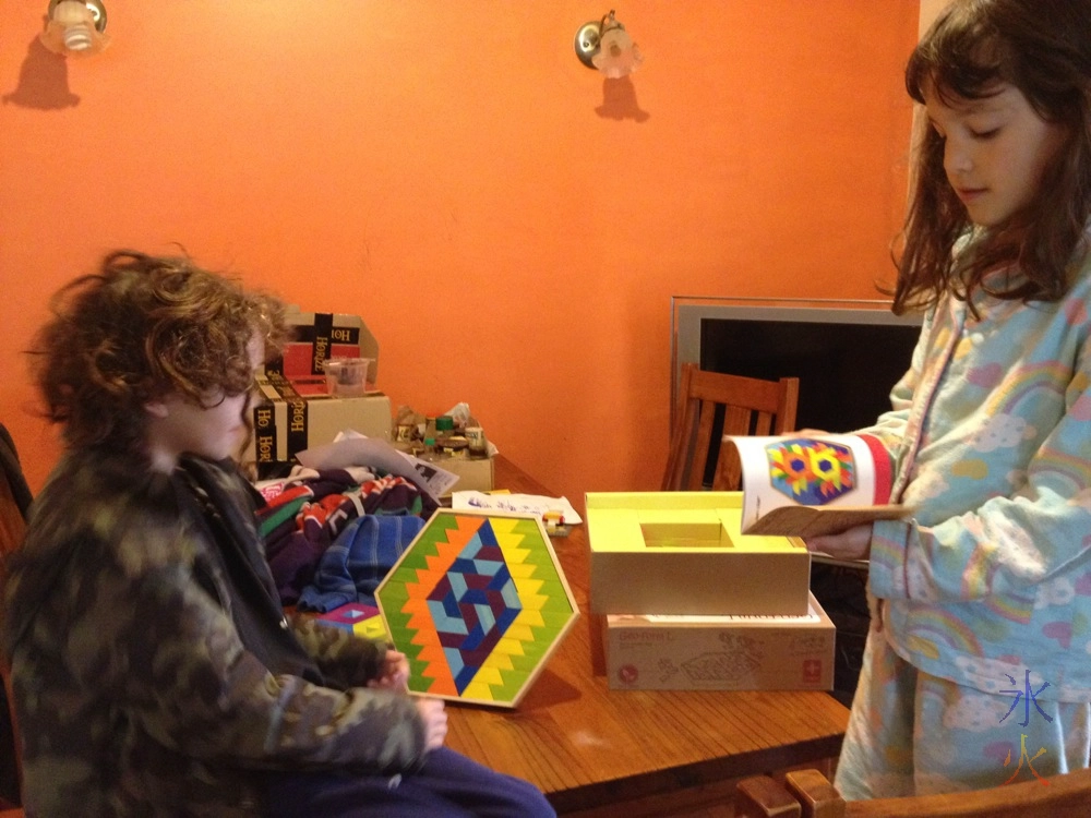 posted on: Monday, 15 September 2014 @ 12:09pm inThe mosaic thing got some good use while it was rainy, with 9yo and 7yo both copying patterns from the book and inventing their own: