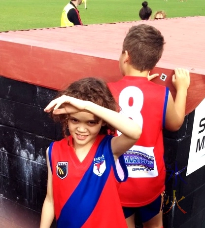 The game only went for a quarter (12mins), the kids had a blast and were disappointed when it ended, but were cheered up by getting to high five the Demons players as they came back out onto the field after half time. I thought they did really well keeping the Year 5s to only two goals (the Mighty GosHawks had two scoring shots, think they only got points). Amusement was watching my scrawny 9yo (who usually plays full forward) desperately tryng to shepherd two massive Year 5s while his friend valiantly attempted to outrun another Year 5 for a scoring shot.