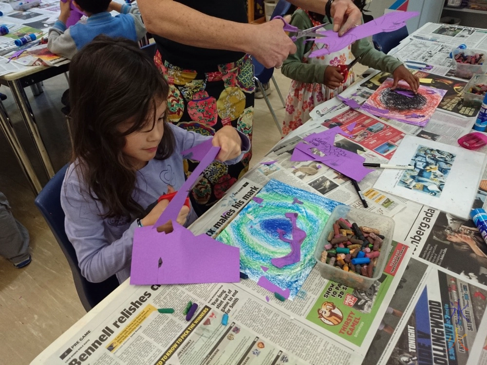 The activity we booked consisted of a tour with stops at specific pieces to discuss them, and an art activity based on what we’d been looking at. We regrouped with the other half of the group for the activity. The facilitator of th activity got the kids to copy a painting of Alice falling down the rabbit hole and anything else from the picture that they wanted to copy, and then we retreated to the activity room where they cut out their drawing of Alice and whatever bits and bibs they’d drawn and rearranged and glued them onto some paper that they had first coloured in with oil pastels. I got some photos of 8yo and then-5yo but not of 10yo as he was in the other group, but they all brought back the pictures that they’d made in the activities which are now residing in their files.