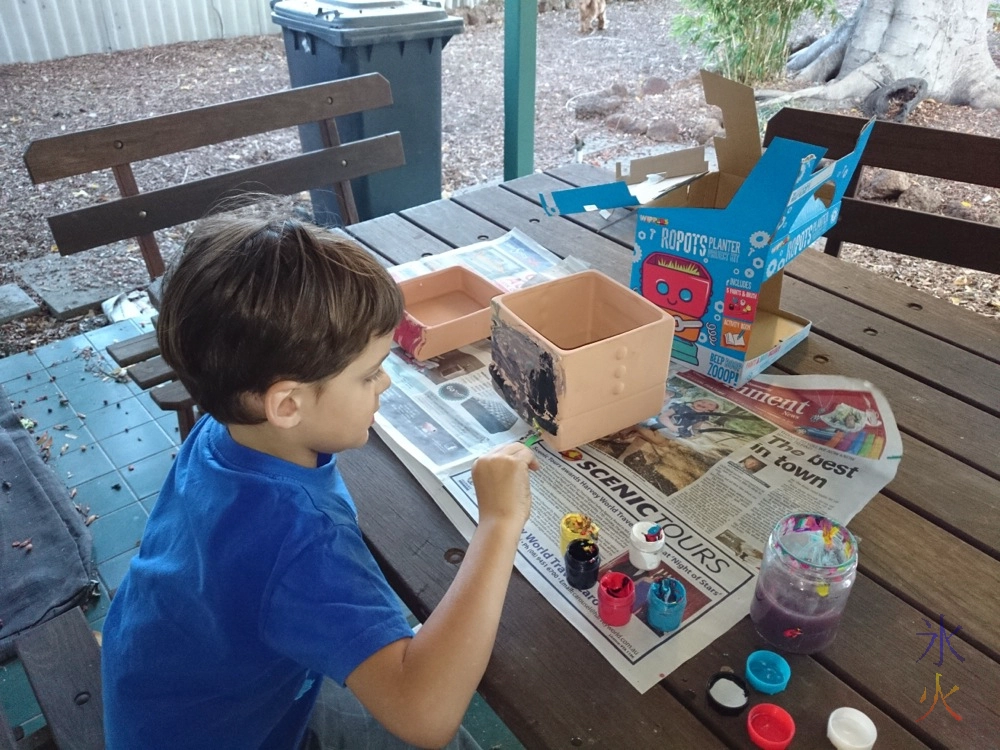 And to close off, the rare artwork from the boys. 6yo got a robot pot (or “ropot” apparently) he could paint and plant seeds in from his bestie. As he wouldn’t wait for help, I’m not sure if the flower seeds that were part of the present survived but if they haven’t, we have shooting garlic that he can plant.