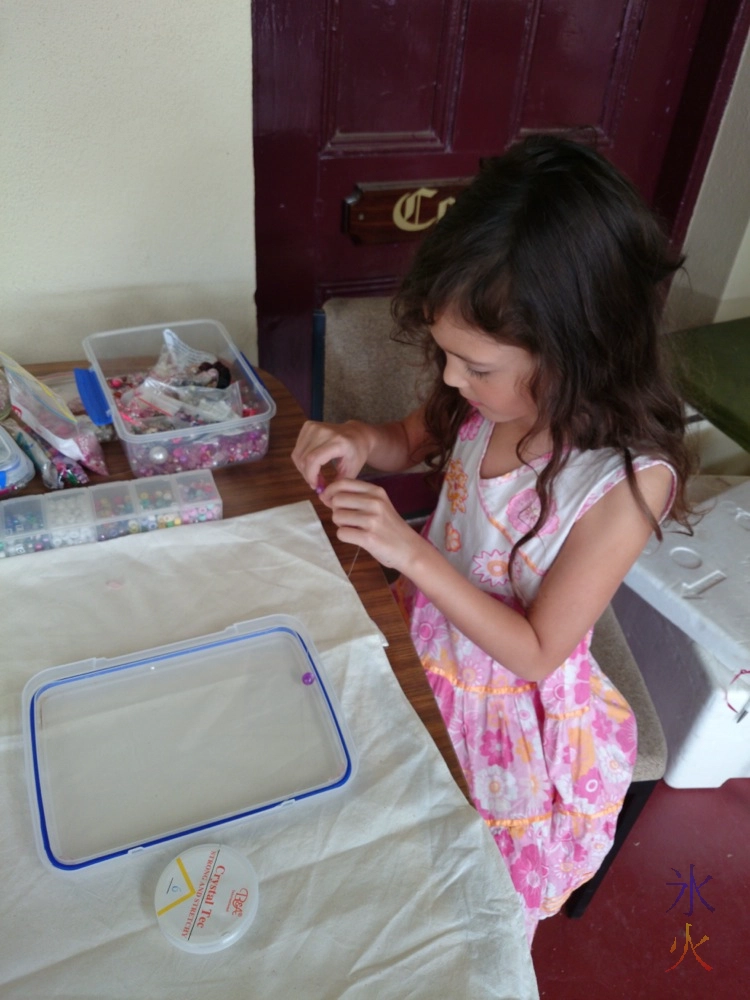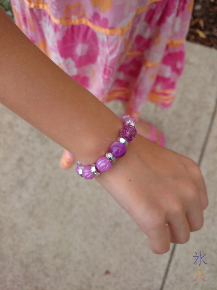 There was a free beading activity and of course 8yo wanted to make something so while JJ ran distraction for the 6yo, 8yo got onto making before we left. She wanted to make a necklace, but I told her to just make a bracelet so we could leave. She chose purple beads and the lady running the activity suggested she put silver between things in as well. It came out quite nicely.