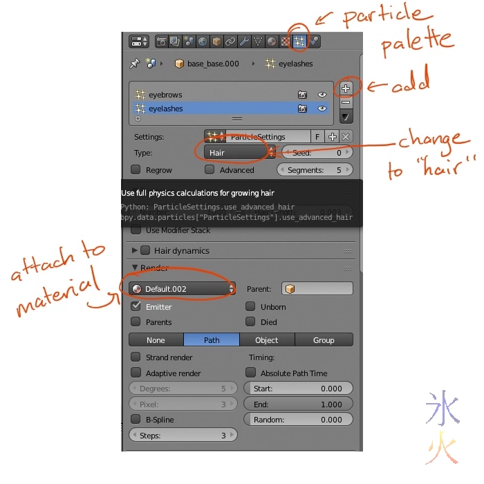 I found the default of 1000 strands good enough for the eyebrows, and had 1 interpolated child per strand. The size (which is hidden under that tootip that I only just noticed and can’t be bothered making a new screenie now) should probably be adjusted to the longest length you want as while you can edit the length in particle edit mode, if you add any more hair strands they will be the max length. For eyelashes and eyebrows set the Cycles Hair Rendering to “Ribbons” from “Thick”. For head hair see how the render looks.