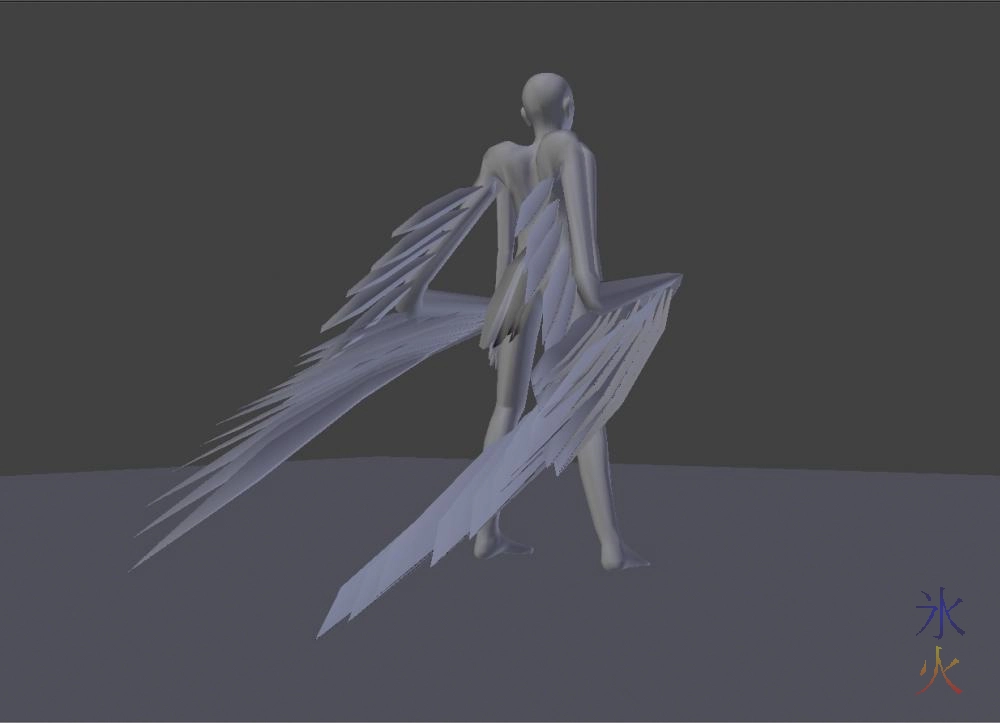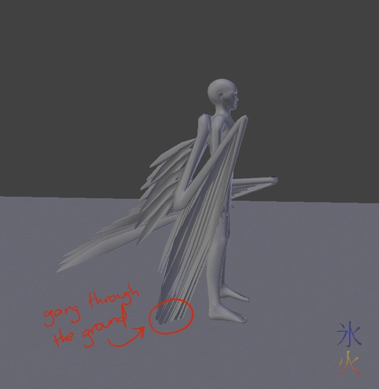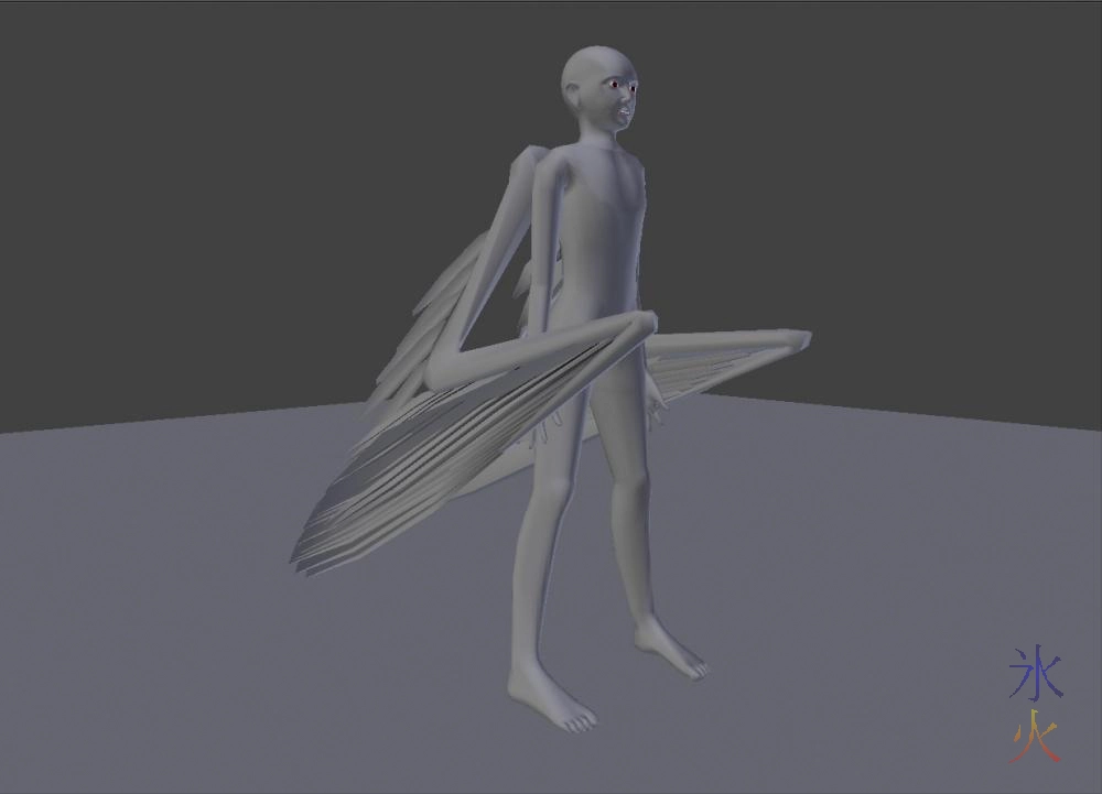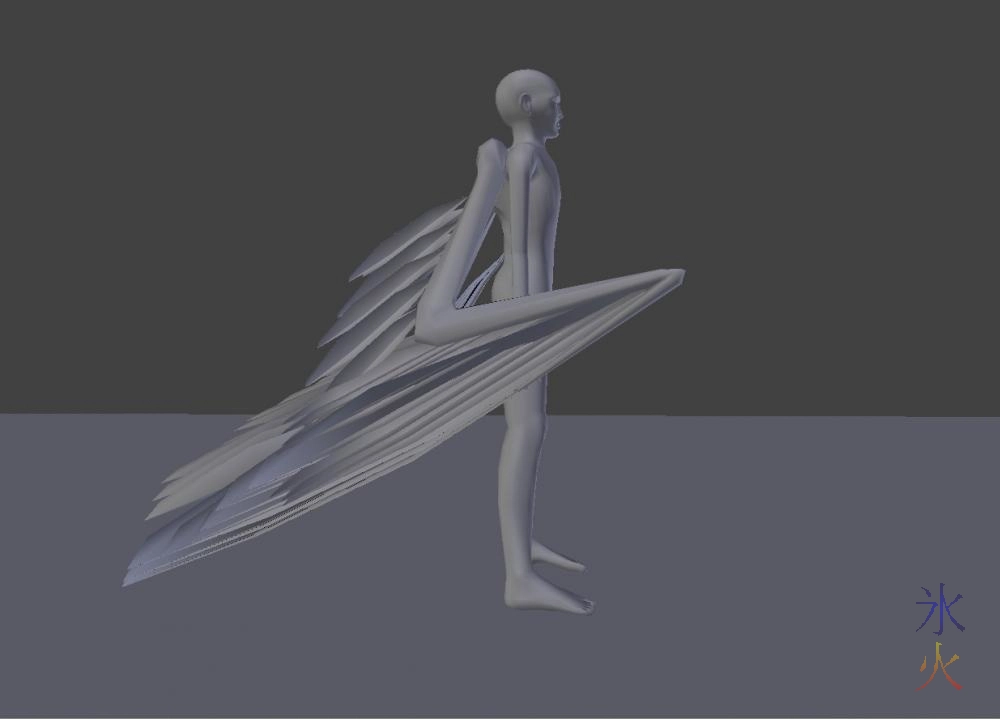 The upper wing arm is nearly as long as the normal arm and the parimaries are about two thirds the height of the model, so folding them the way they’re “normally” (or perhaps canonically by every winged character ever seeing as there aren’t any flying winged humans yet) folded resulted in them clipping through the ground. They obviously wouldn’t want their feathers dragging along the ground so I stuffed around with various poses for ages before finally getting stuck on hanging the upper arms down like the normal arms and just arcing the wing forearms as high and forward as I could without losing the wing tips in the ground.
